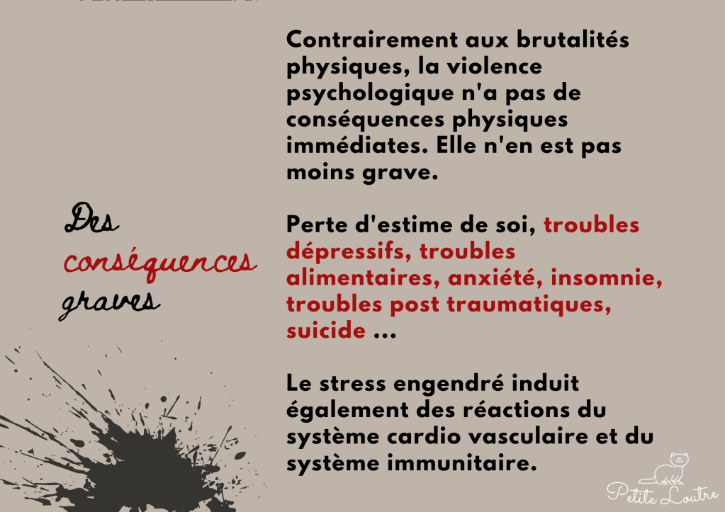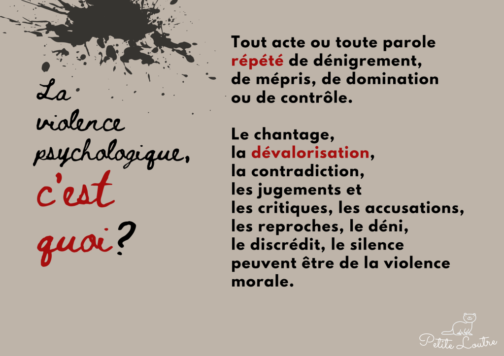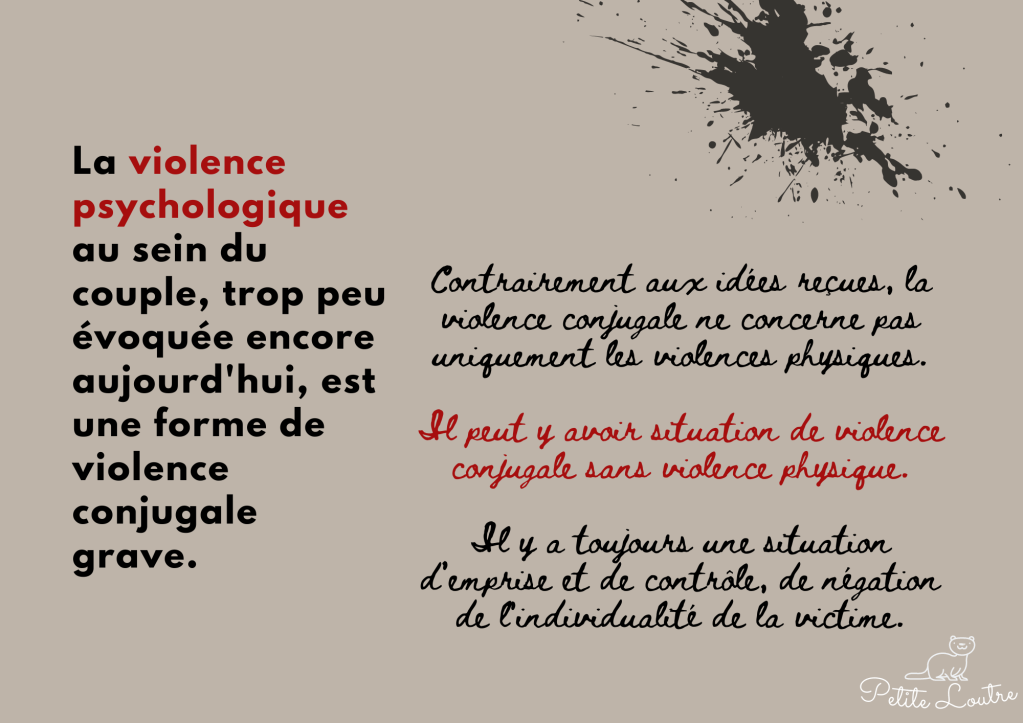 La violence conjugale est multiforme. Préalable à toute situation d’emprise, la violence psychologique est toujours présente et suffit à installer un climat violent avec des conséquences graves.